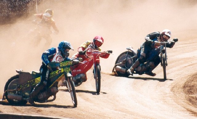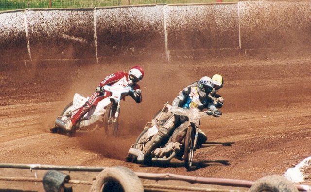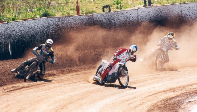 Robbie reeled off four perfect starts and comfortable victories (beating Stoney twice!) before a rotten start off gate 4 in heat 15. He tried the wide line on the first turn but ran into the quagmire and slowed so dramatically that Simon ran into him! After a lengthy delay to straighten out the bikes it was all four back to the tapes but Robbie cocked it up again and his forays into his normal happy hunting grounds (inches from the fence) just lost him more and more ground. Scud looked very uneasy with the greasy conditions and never got it together. Simon was the star of the show yet again. It was a crying shame that the track was so wet as he could have demonstrated to such a large audience what the Owlerton faithfull have been enjoying for some time now, namely his amazing tallent for RACING!!! Having given Stoney a good run in heat 5 he went one better in heat 15 which must have given him a lot of satisfaction. Adam recovered from a slow start to the meeting, switching to his new machine to finish with a well deserved win over non less than tac-sub Mick Powell! Sean returned to the track, less than 100%, but you wouldn't have known it. Having missed the gate in heat 13 he stalked PK for a couple of laps before attempting a wide line on turn 3. Once he hit the piled up sh**e on the outside it just had his chain straight off depositing Sean on his arse yet again. Sean was quickly back to his feet and must be congratulated on not swearing when Suzi Perry stuck the mike under his nose! Young Lee made a dream gate to win heat 2, but then found it a bit harder in his remaining rides, while the Owlerton faithful are still looking forward to seeing Andy reproducing his away form. Having said that he capitalised on a Rusty Harrison mistake to steal 2nd place in heat 2, and wound in Barry Campbell before rounding him on turn 4 of the 3rd lap in heat 11 which was no mean feat given the conditions. All in all a great team performance, but such a shame the cameras didn't see what Owlerton is really capable of.